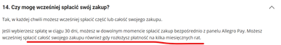 Panel obsługujący Allegro Pay jest mało przyjazny w sytuacji gdy chce się spłacić całość lub rozwiązać Umowę. Każdy, powtórzę każdy zakup powinien mieć opcję spłaty całości, a nie ma, bo spłata przypada np. ponad 30 dni. W panelu powinna być również możliwość zamknięcia kredytu lub zmniejszenia go, a nie ma. Ja rezygnuje, bo nie lubię takich "sprytnych" rozwiązań.