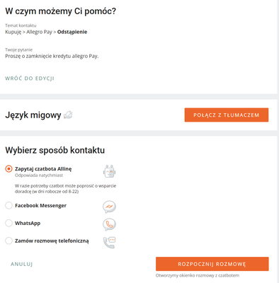 @raff29 Zgodnie z tym, co widzisz na ekranie. Możesz skorzystać z Messengera, WhatsApp lub zamówić rozmowę. Jeśli wybierzesz Allinę, ona również może połączyć Cię z konsultantem Allegro na czacie.