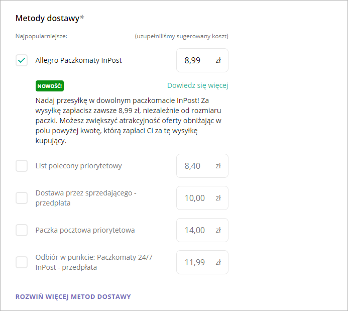 Przesyłkę do Paczkomatu InPost nadasz znacznie łatwiej – wszystko zrobisz na swoim koncie Allegro Lokalnie bez przechodzenia na stronę InPost! Wystarczy, że podczas wystawiania przedmiotu na Allegro Lokalnie:
