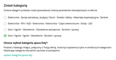 Ta kategoria (Dom i ogród > Oświetlenie > Oświetlenie zewnętrzne > Żarówki i oprawy) jest już w zbiorze kategorii podobnych dla tego produktu, więc jeśli zmienisz klategorię oferty na Żarówki i oprawy, będziesz mógł ją połączyć w katalogu.